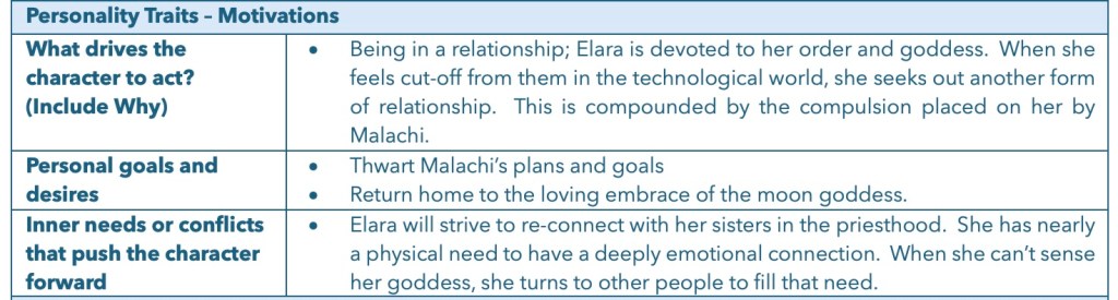 You can already see what is going to drive Elara’s action as she faces obstacles in her journey. Malachi (the antagonist of the tale) is the reason she has been cut off from her sisterhood. Since I’m early in the writing of her story, I can’t share how these traits, motivations, and goals have translated to the page, but I know they will