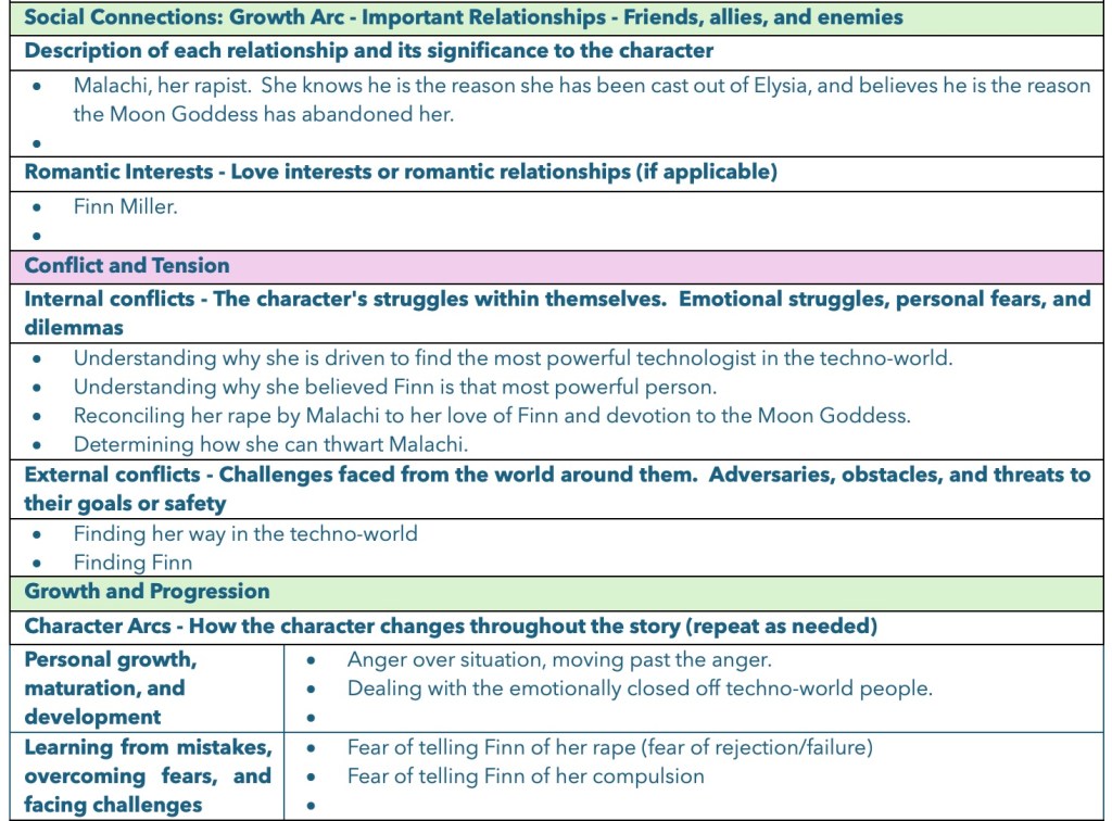 Here are these sections for my character Elara. She is still a work in progress, but is shaping up nicely. If you read through this, I hope you can get a sense of her story and how her interactions with the other characters would change her in a satisfying manner. I hope to publish Elara’s tale before the end of the year.